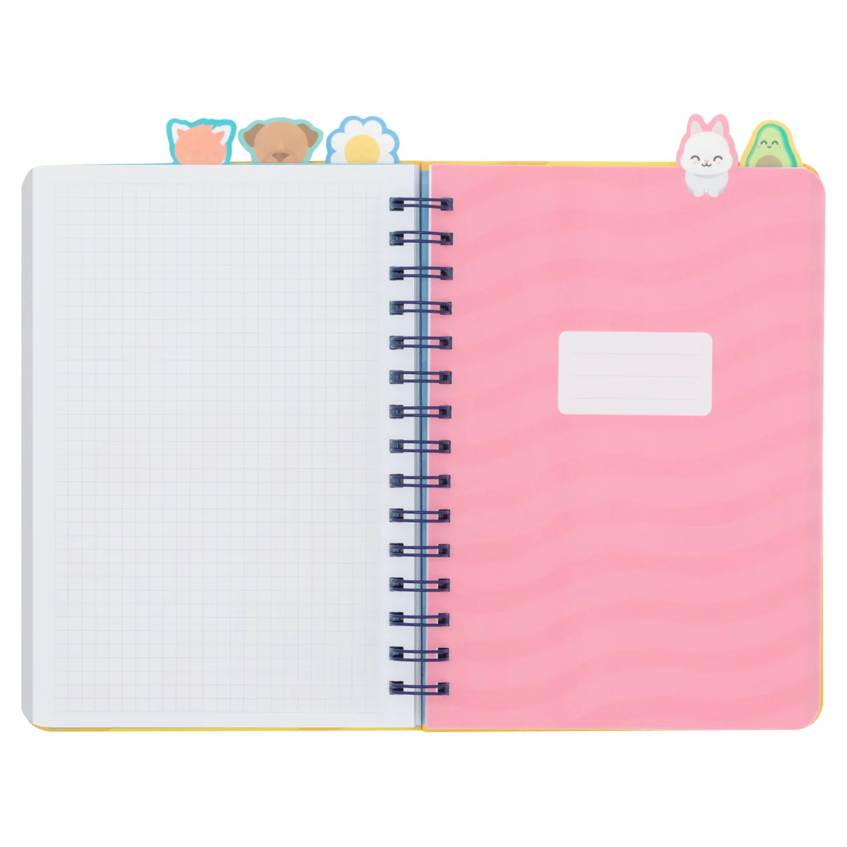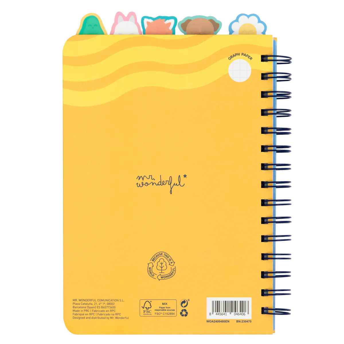 Libreta A5 con interior a cuadros. Cuenta con 5 divisores internos con pestaña, cada uno de ellos con un personaje Mr. Wonderful (margarita, perro, conejo, panda rojo y aguacate), lo que la hace ideal para dividirla por asignaturas o temas. Con 160 páginas.