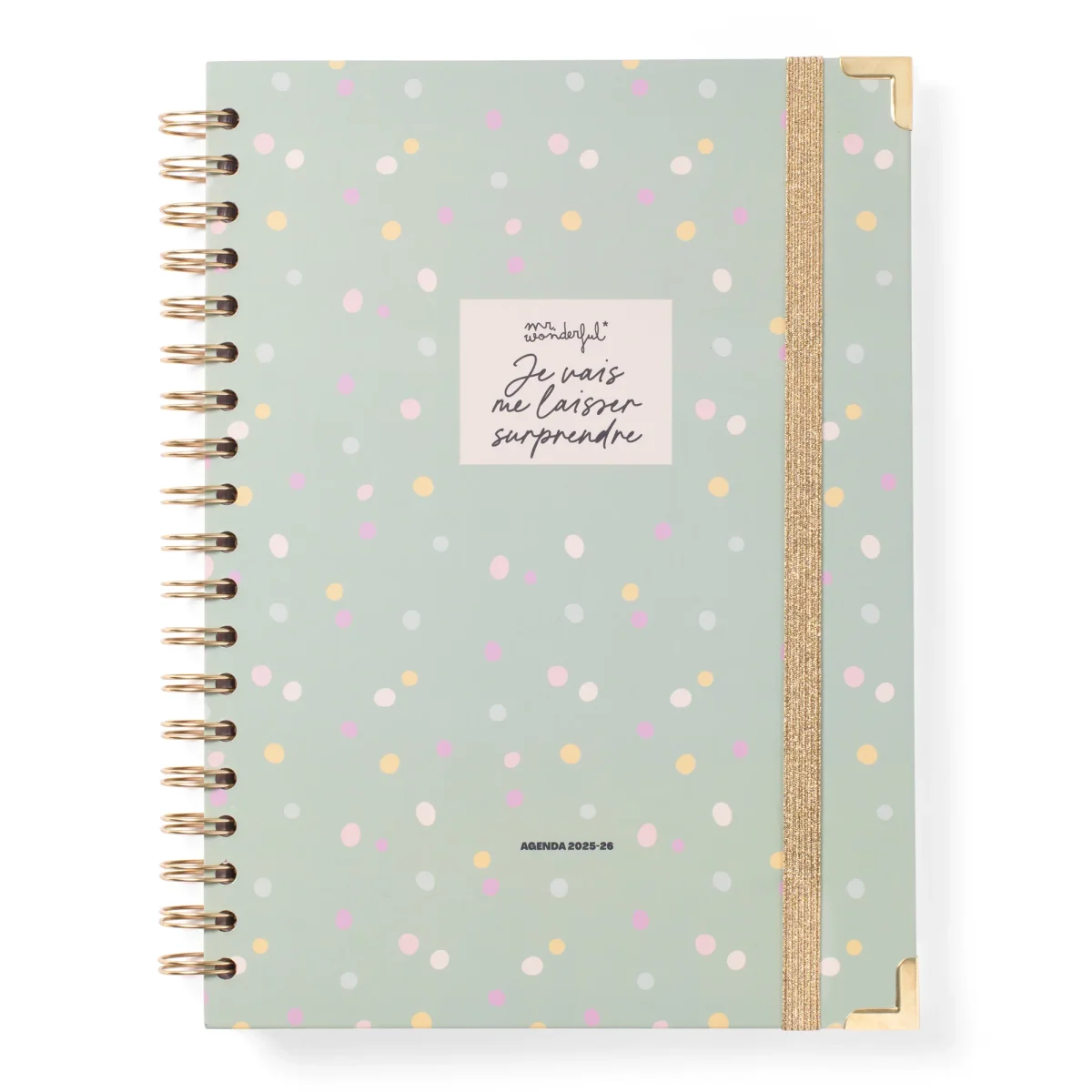 Agenda de style Office de Mr. Wonderful, un nouveau type de design que nous avons introduit il y a quelques éditions. Il est un peu plus sobre et discret que notre style plus classique, il plaira donc à un public un peu plus âgé. Avec une organisation hebdomadaire, il va de septembre 2025 à août 2026 et est plus grand que les autres agendas de la collection, ce qui en fait un agenda de bureau idéal. Cet agenda contient :