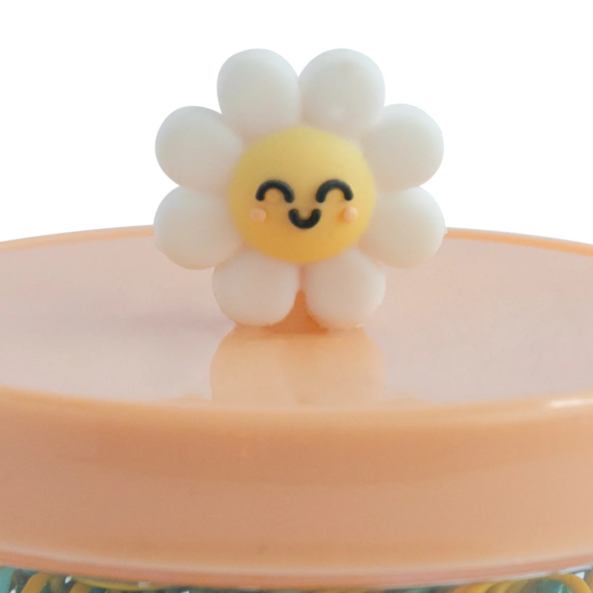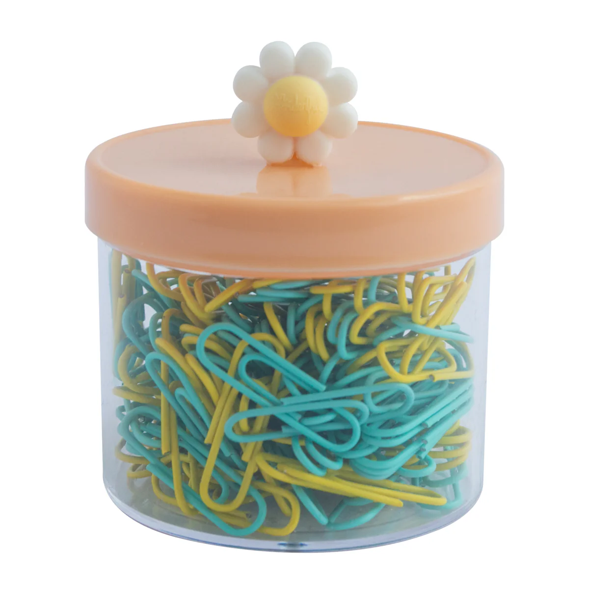 Botecito de plástico transparente con 150 clips de papel metálicos y una margarita Wonder decorando la tapa.