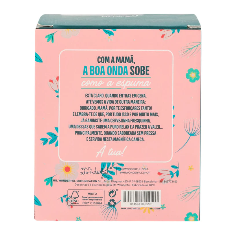 Se há uma mãe que merece tudo é, sem dúvida, a tua. Não é verdade que estamos de acordo quanto a isso? Pensando na mamã, que merece como ninguém todos os bocadinhos para desfrutar de uma bebida saborosa e fresquinha, na Mr. Wonderful desenhámos especialmente para ela esta caneca de cerveja para mães com uma divertida mensagem. Mas não julgues que a mensagem termina aí, sabemos que adoras personalizar qualquer presente que ofereces à tua mãe e temos um espaço reservado na caixinha desta caneca para lhe escreveres uma dedicatória bem bonita que lhe chegue ao coração. Apostamos que agora ainda gostas mais desta caneca de cerveja com mensagem. Claro, é precisamente o que andavas à procura. Tem uma capacidade de 500 ml, para que a mamã tire o seu tempo saboreando pouco a pouco esse ouro líquido que tanto apetece quando está calor e até quando não está! Como vocês gostam tanto de celebrar qualquer coisa, estamos convencidos de que, num abrir e fechar de olhos, vais estar a brindar com a tua mãe, e sabemos muito bem o que vais dizer enquanto fazes tchim-tchim com a sua caneca de cerveja: “Mamã, tu mereces tudo (e esta cervejinha, também)”.