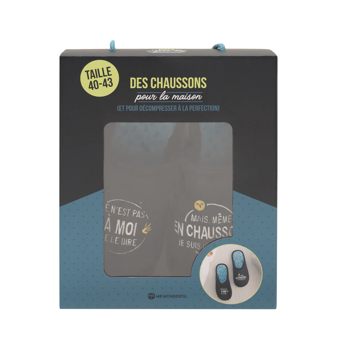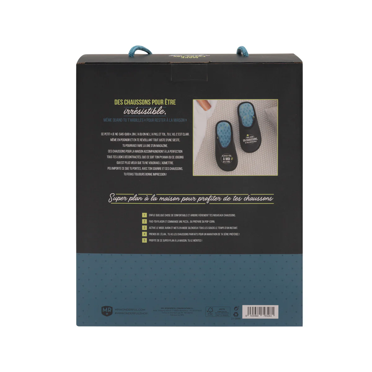 Ce n’est pas à toi de le dire, mais après tout, si c’est la vérité, pourquoi s’en priver. Oui, n’aie pas honte de le dire haut et fort : tu es irrésistible ! Quel est ton secret ? Chez Mr. Wonderful, nous pensons que pour être au top, que ce soit niveau forme ou simplement pour avoir bonne mine, il est nécessaire de prendre du repos. Voilà pourquoi nous te proposons cette superbe paire de chaussons Mr. Wonderful. Parce qu’après être parti à la conquête du monde toute la journée, rien de plus normal que d’en avoir plein les pieds. Une fois que tu les auras, tu ne penseras plus qu’à une chose : enlever tes chaussures et enfiler tes super chaussons pour faire une pause et recharger tes batteries. Ils sont tellement moelleux et doux que tes pieds te remercieront. Et tu verras qu’après ce repos bien mérité, tu seras d’autant plus resplendissant. En plus, grâce à leur message partagé entre les deux chaussons, même quand tu seras en mode pause canapé, tu continueras d’être irrésistible. Bref, ces chaussons sont faits aider les personnes irrésistibles à continuer de l’être même en se reposant. Tu viens de trouver chausson à ton pied !