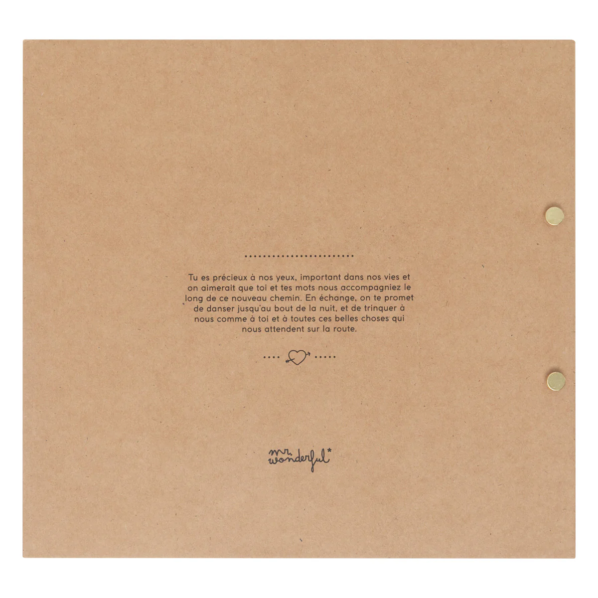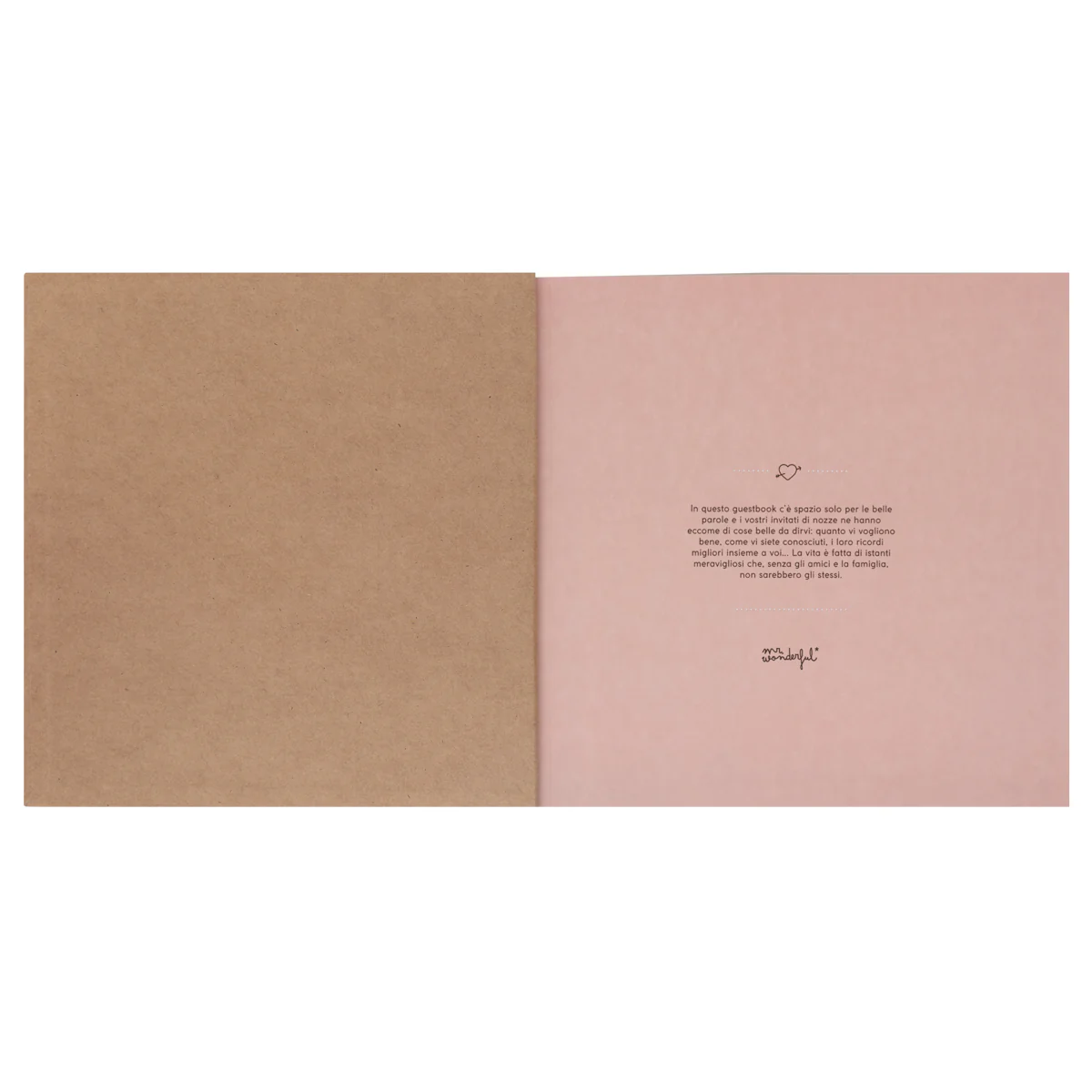 Guestbook di nozze con un messaggio di congratulazioni sulla copertina e 64 pagine con diversi spazi in cui gli invitati potranno scrivere la loro dedica. È certificato FSC, che ne garantisce la produzione con carta proveniente da foreste gestite responsabilmente.