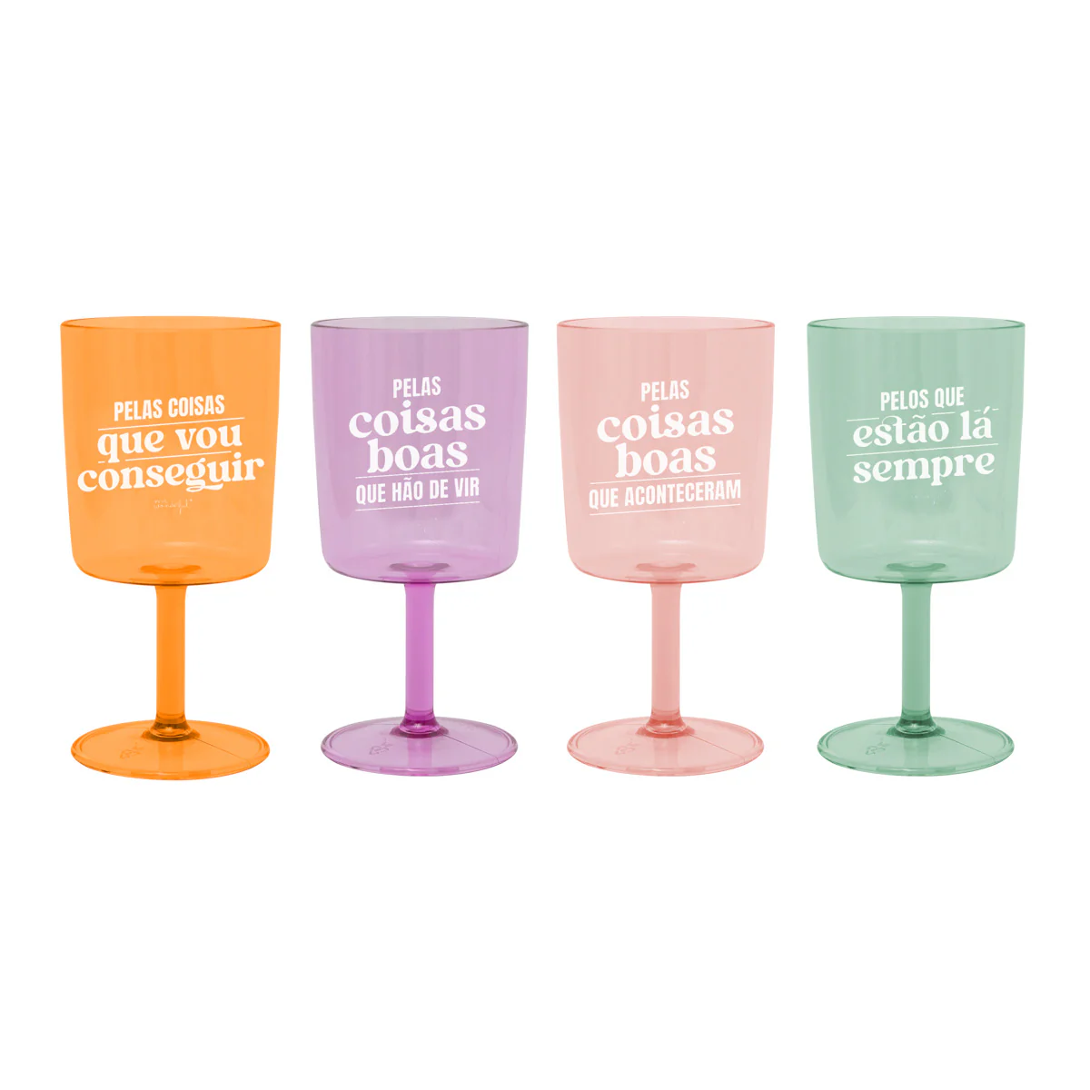 Kit de 4 copos de vinho fabricados em PS. Cada um deles tem impressa uma divertida mensagem em português.