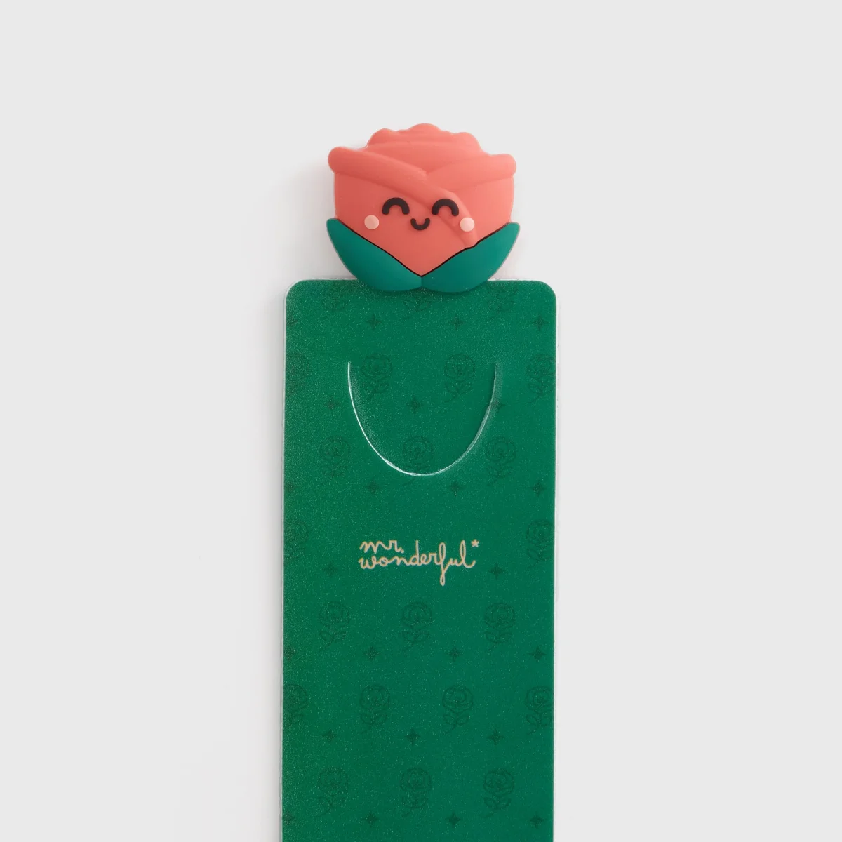 Marcapáginas realizado en plástico, con una forma superior relacionada con la festividad del Día del Libro de San Jorge, hecha de caucho.