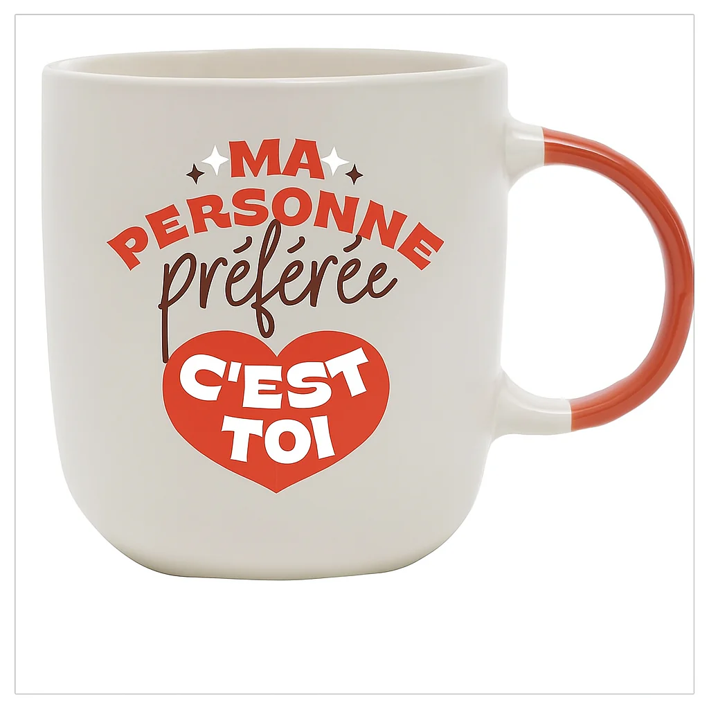 Mug en céramique avec un message d’amour en français. Le message est divisé en deux parties : l’une d’entre elles est visible en permanence est l’autre est dissimulée sous l’encre d’un cœur qui vient compléter le design. En chauffant le contenu du mug, l’encre du cœur laisse apparaître le message qui se cache dessous.
