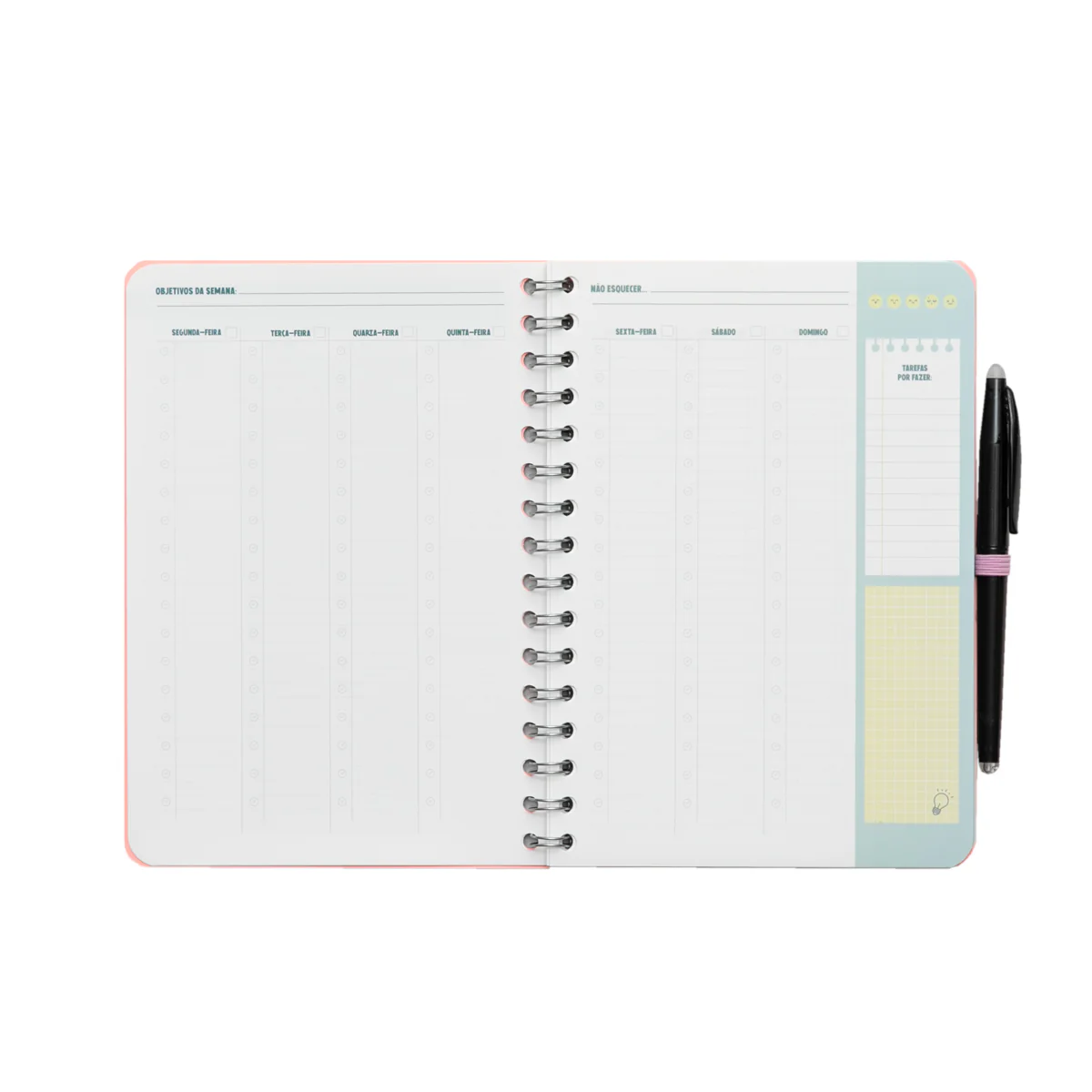 Organizador mensal e semanal (mês corrido de 5 semanas), com encadernação em espiral e fecho com elástico.