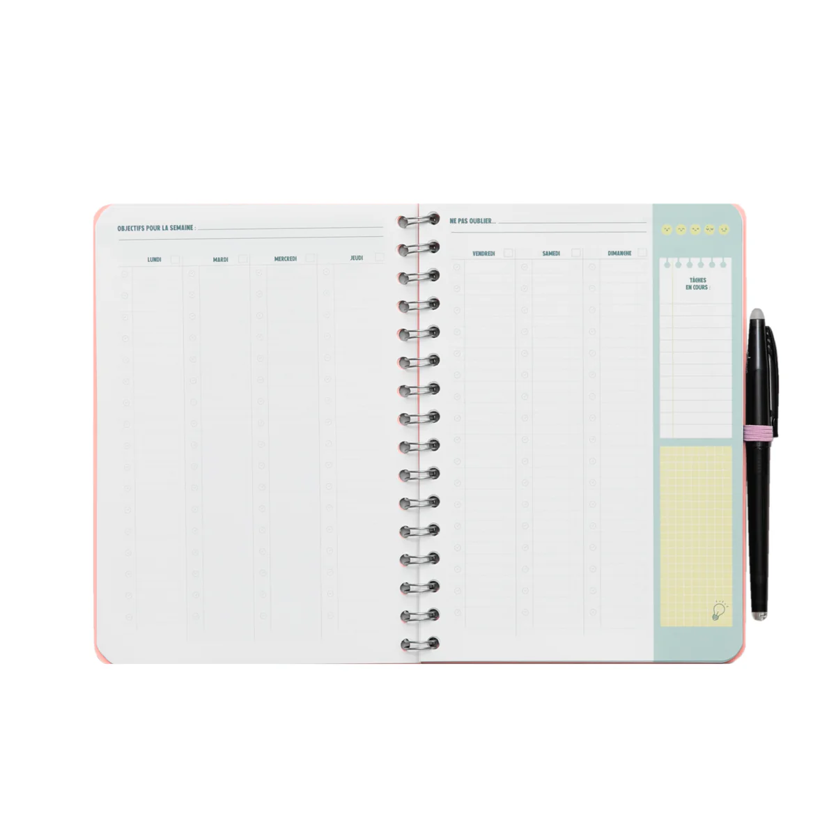 Planning mensuel et hebdomadaire (chaque mois est suivi de 5 semaines), avec reliure à spirale et fermeture élastique. Il comporte 35 feuilles d’ardoise blanche effaçables, de sorte qu’une fois le mois et/ou les semaines écoulés, il est possible d’effacer le contenu. Il comprend un stylo effaçable à pointe fine avec une gomme en caoutchouc à l’extrémité pour effacer (il est également possible d’effacer les feuilles d’ardoise avec un chiffon légèrement humide).