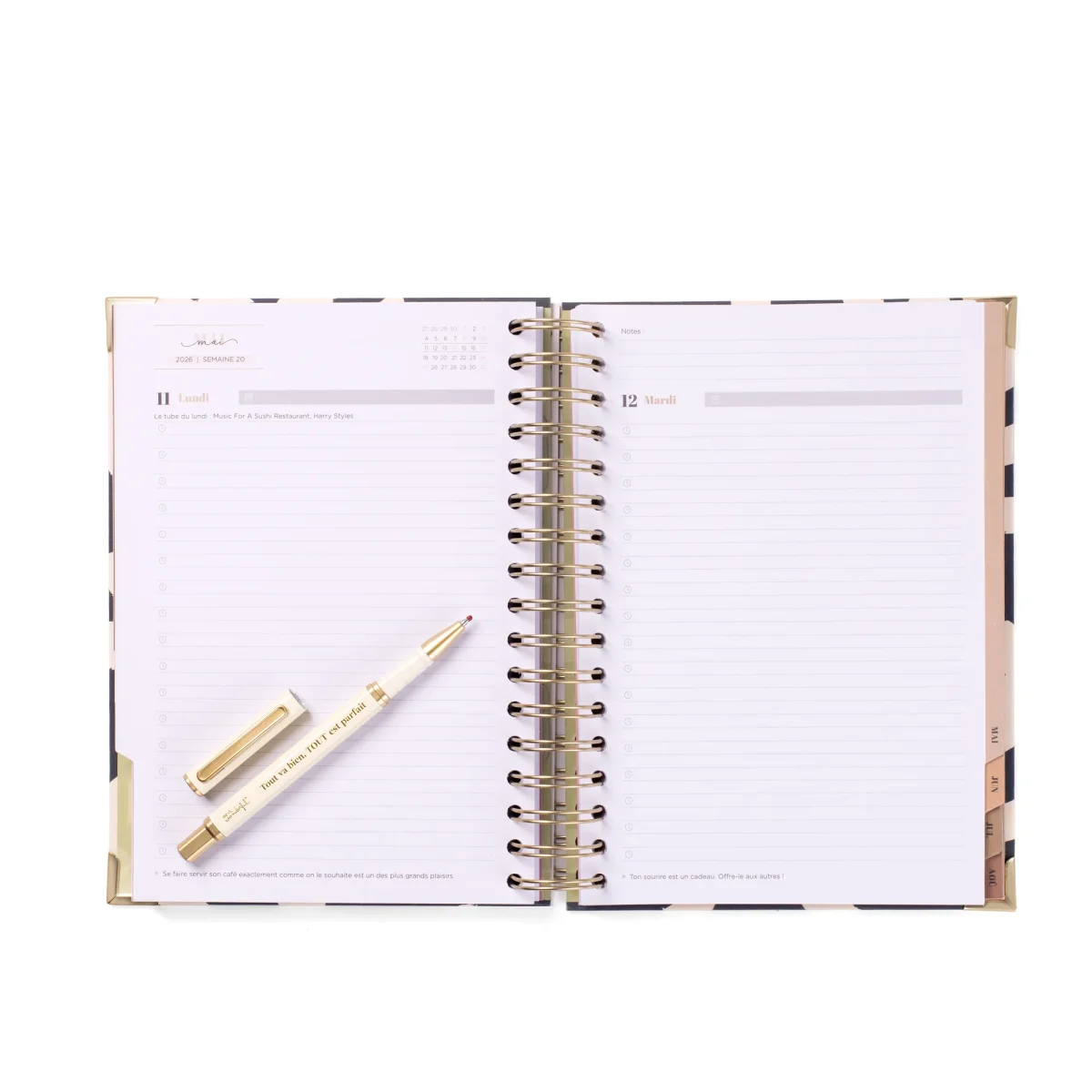Set présenté dans une jolie boîte premium, composé d’un stylo de grande qualité, fabriqué en métal et portant le même message que l’agenda Office de Mr. Wonderful qui l’accompagne. Ce style de design, que nous avons déjà proposé lors de précédentes éditions, est un peu plus sobre et discret que notre style classique, ce qui séduira un public légèrement plus âgé. Avec une organisation journalière, l’agenda couvre la période de fin septembre 2025 à fin août 2026 et contient :