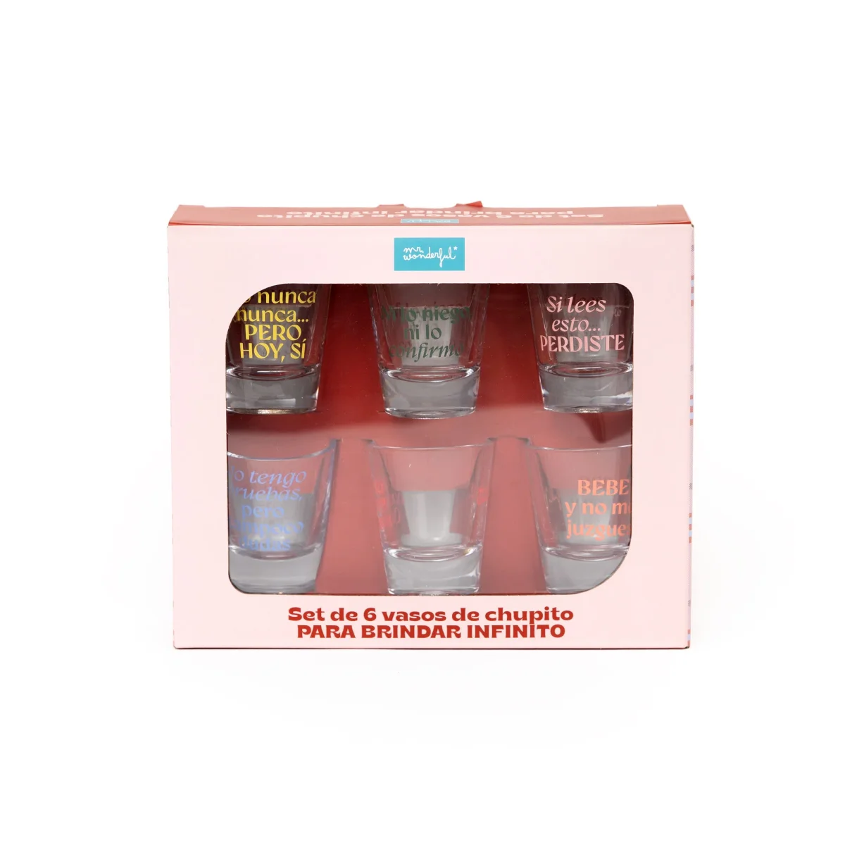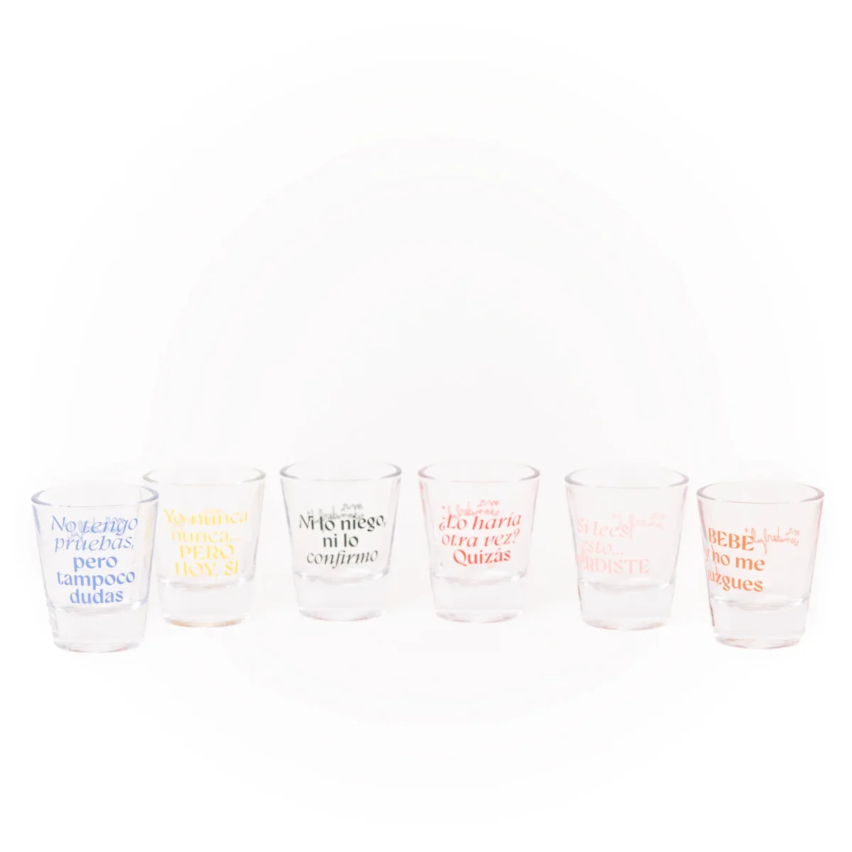 Set de 6 vasos de chupito realizados en vidrio, con mensajes diferentes entre sí. Capacidad: 35 cl.