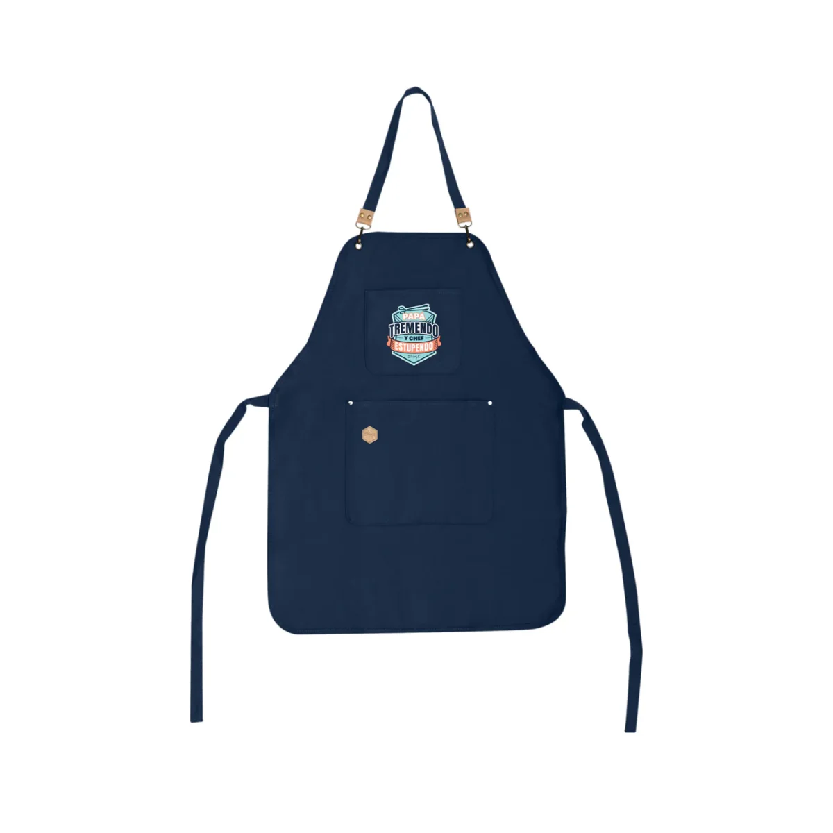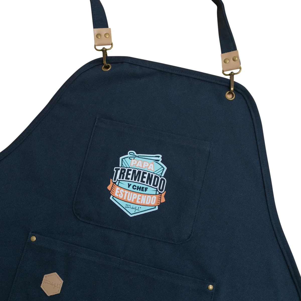 Set de delantal + espátula de madera con mensaje en español dirigido a padres, en ambos elementos. El delantal está realizado en algodón, con detalles decorativos en metal y en PU. Cuenta con tres bolsillos en su parte frontal y el diseño está impreso justo encima de uno de ellos. La espátula está realizada en madera.