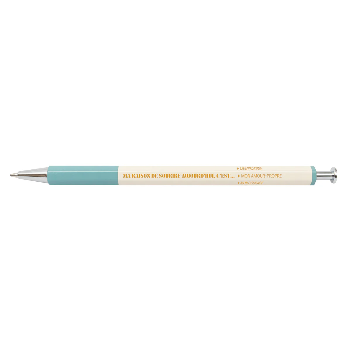 Stylo en bois, avec une phrase principale + 7 concepts secondaires qui complètent la phrase principale, de sorte que tu peux en « utiliser » un pour chaque jour de la semaine. Message principal : Ma raison de sourire aujourd’hui, c’est… Concepts secondaires :