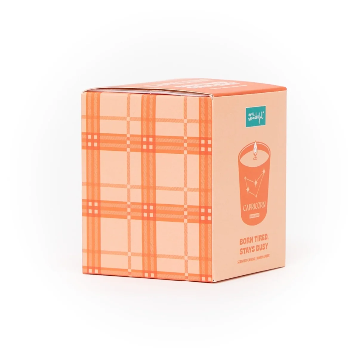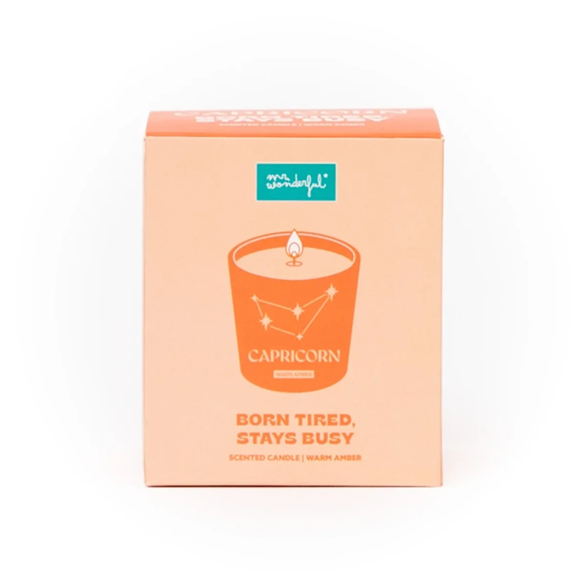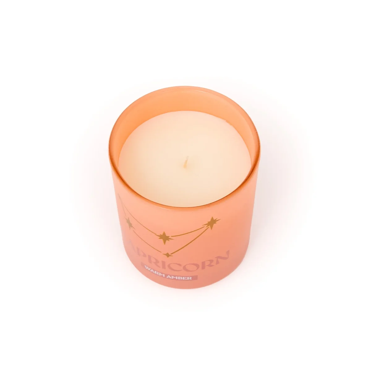 Vela perfumada con aroma a Warm amber. Se presenta en un envase de vidrio en el que se ilustra el nombre en inglés y la constelación del signo zodiacal de Capricornio.
