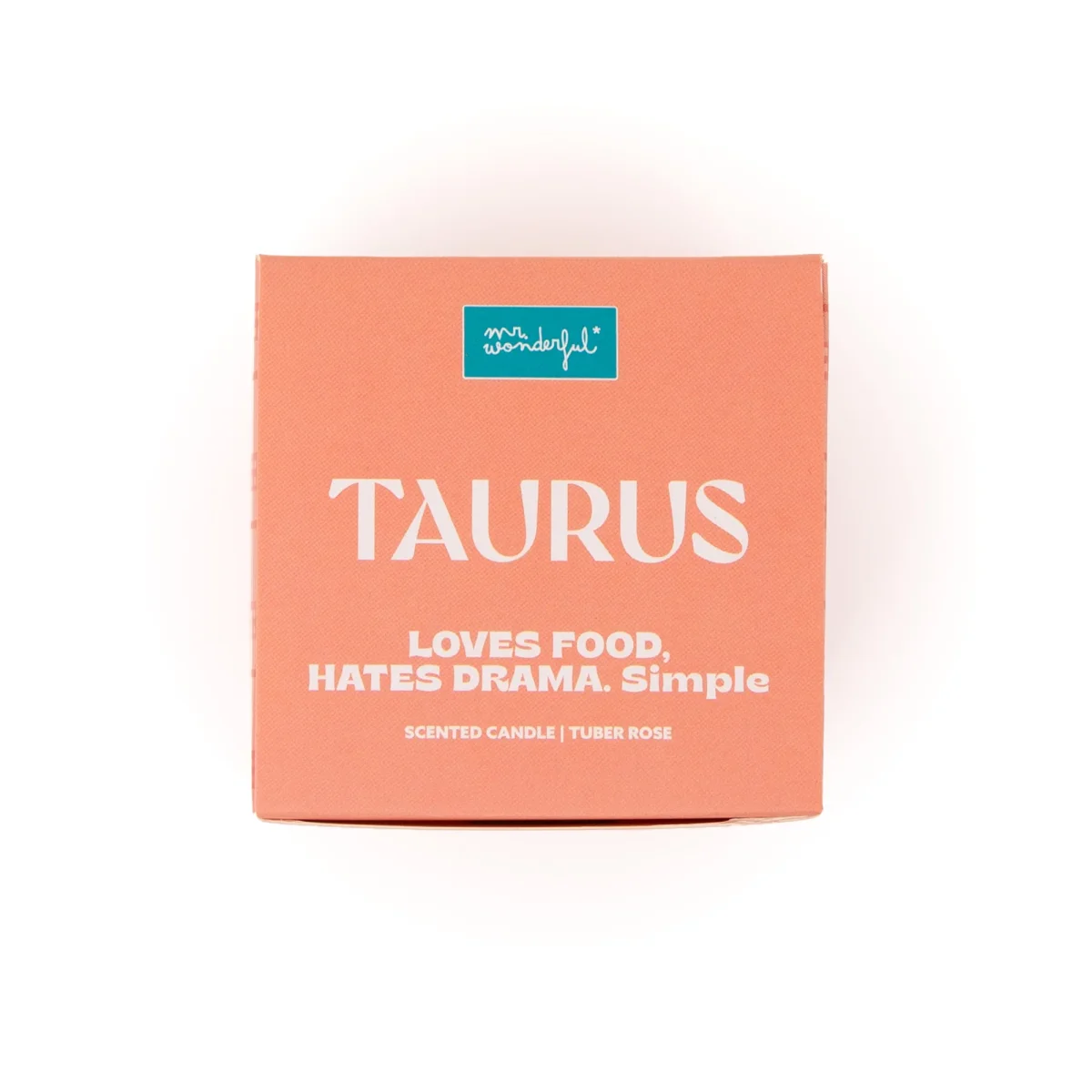 Vela perfumada con aroma a Tuber rose. Se presenta en un envase de vidrio en el que se ilustra el nombre en inglés y la constelación del signo zodiacal de Tauro.