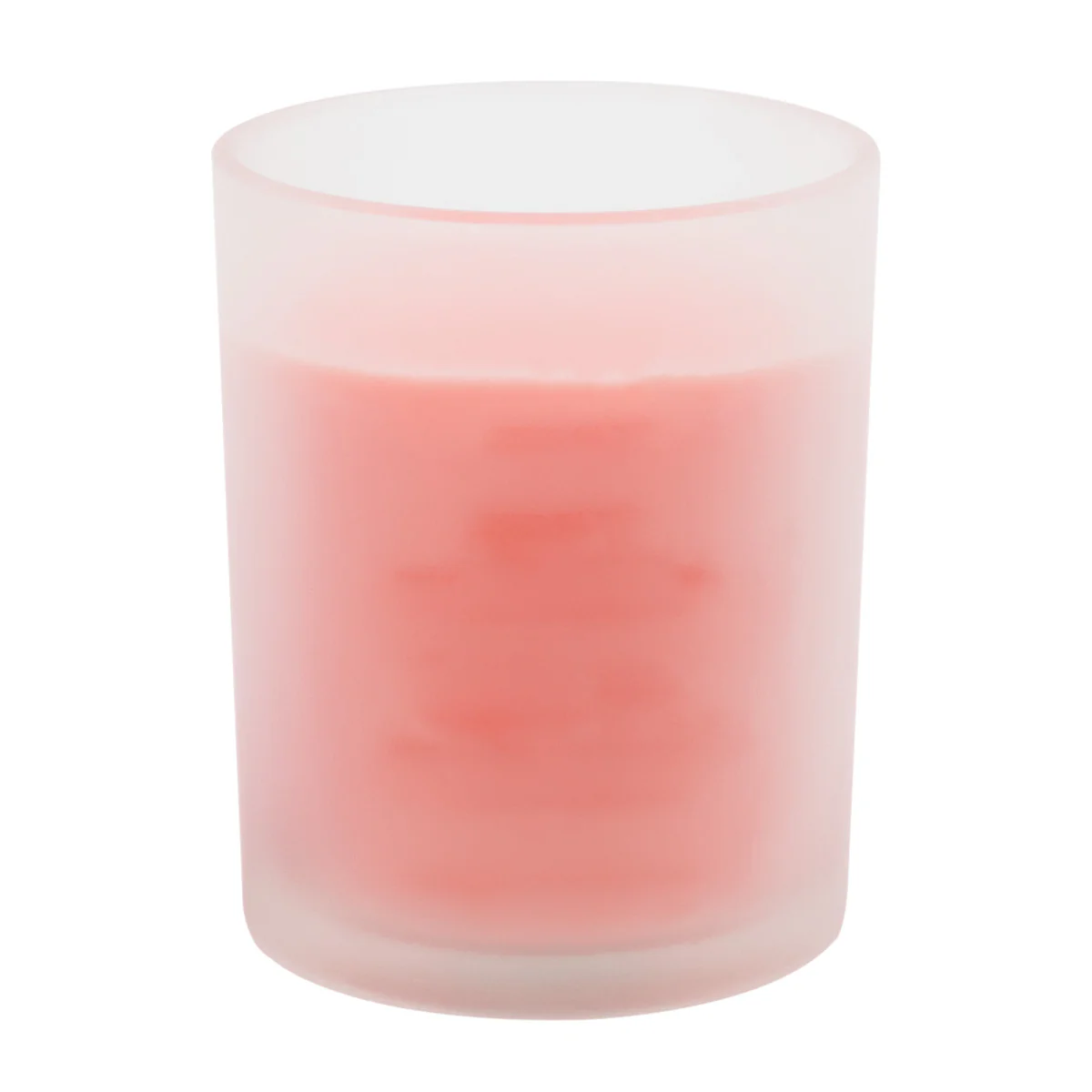 Vela feita de cera vegetal colorida, apresentada em recipiente de vidro transparente. Aroma: tuberosa.